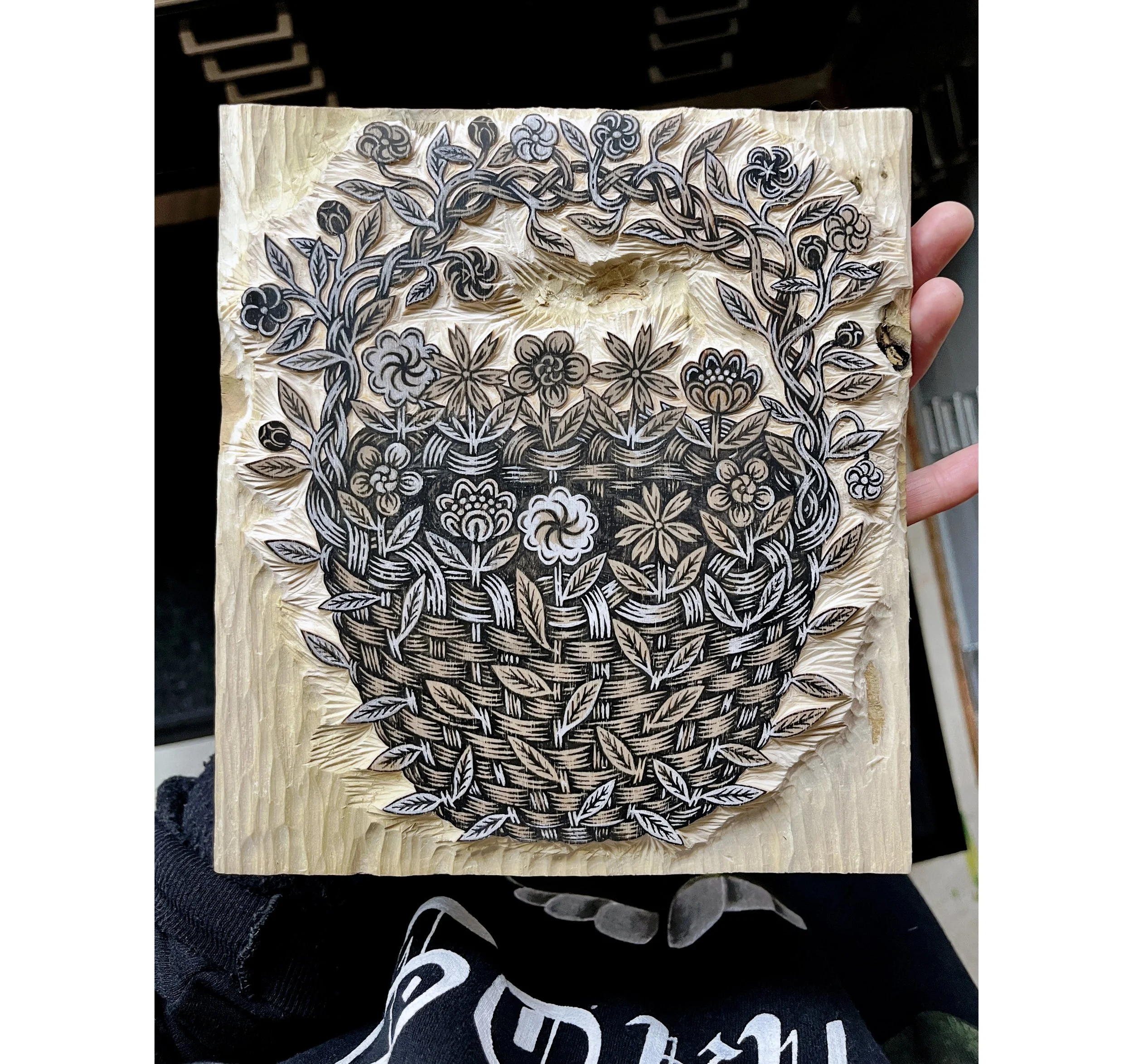 “WOVEN BASKET” is a new B&W woodblock print by Valerie Lueth, currently in progress at Tugboat Printshop.